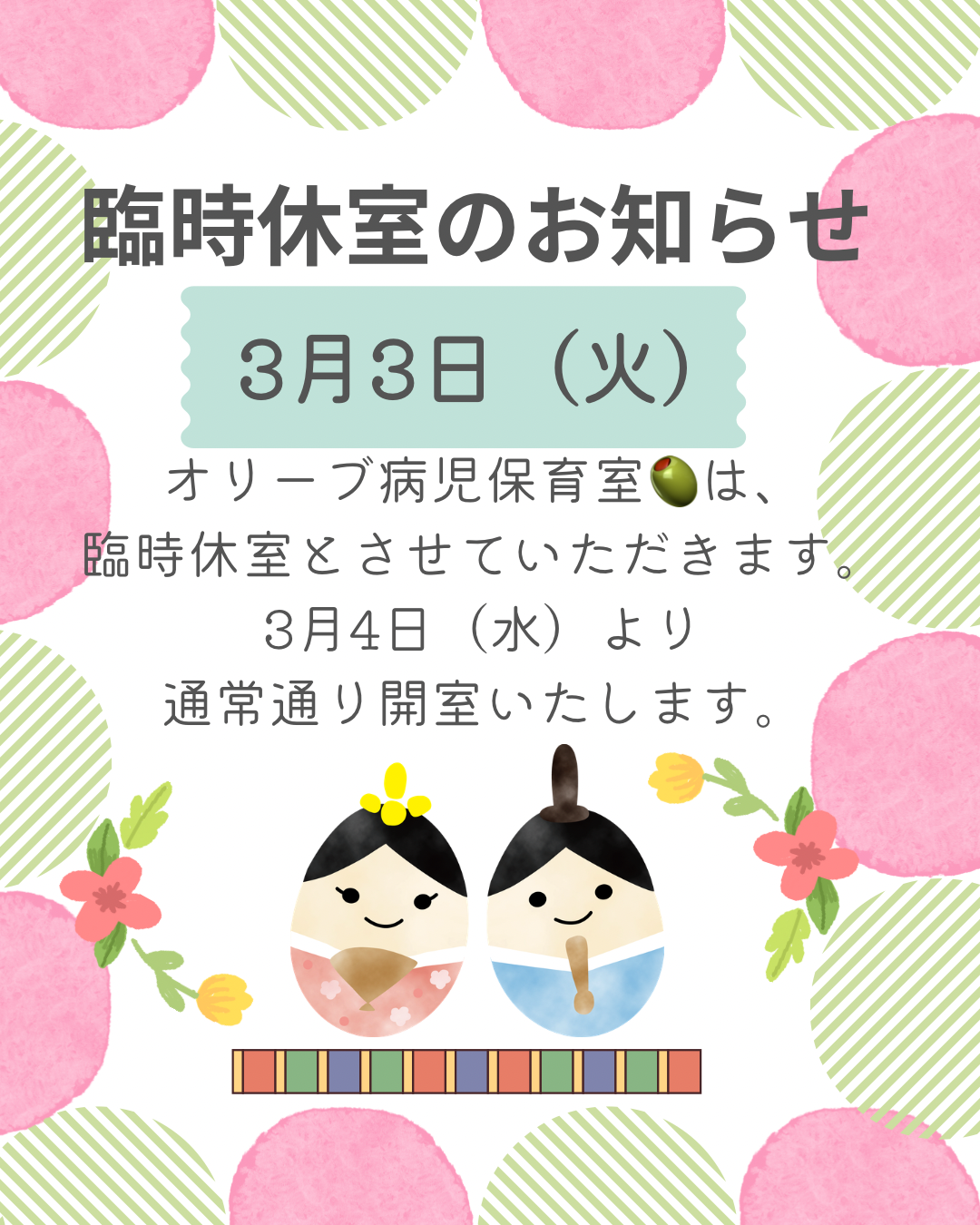 2026年02月24日 臨時休室のお知らせ 日頃よりオリーブ病児保育室をご利用いただきありがとうございます。誠に勝手ながら3月3日(火)はオリーブ病児保育室を臨時休室とさせていただきます。3月4日(水)より平常通り開室いたします。ご不便おかけし申し訳ございません。よろしくお願いいたします。 前の記事 一覧へ戻る
